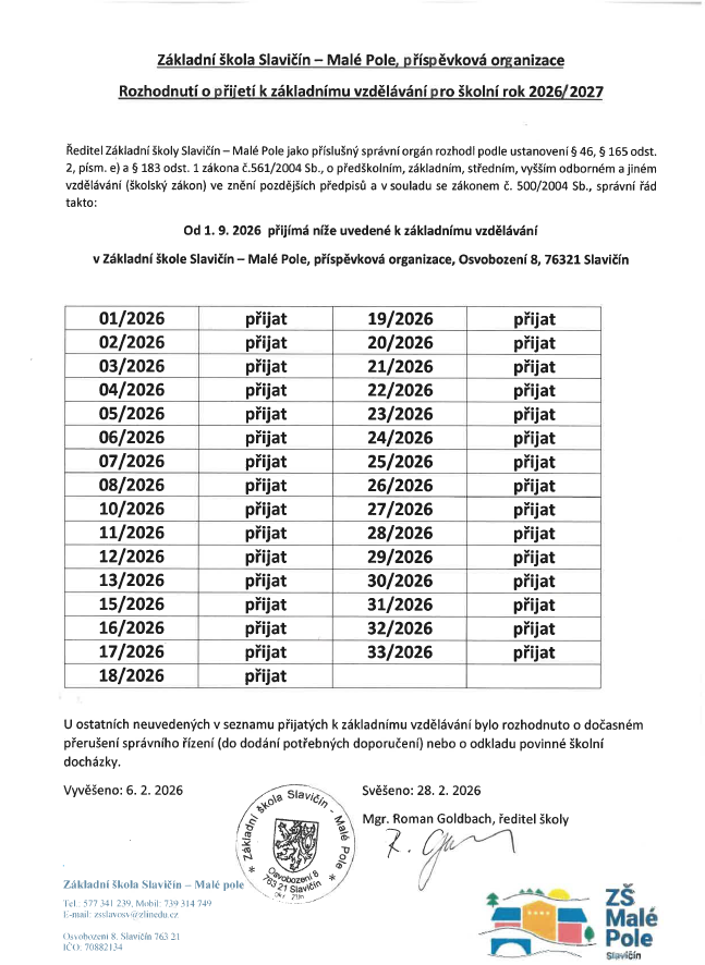 Milí rodiče budoucích prvňáčků, letos se bude zápis konat 3. a 4.2. 2026. Všechny informace ohledně zápisu najdete zde na stránkách školy, nebo na Dni otevřených dveří 20.1. 2026, popřípadě se na nás obraťte písemně či telefonicky.