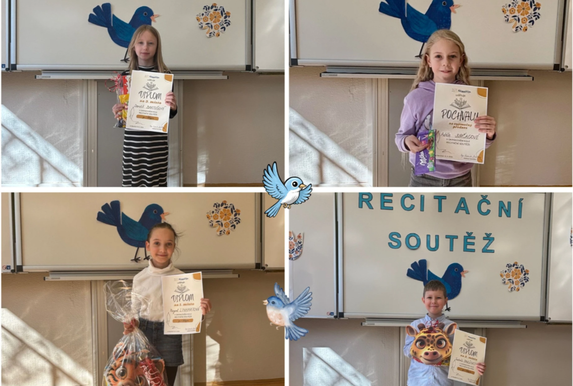 Ve středu 18.3. 2026 se uskutečnilo okrskové kolo recitační soutěže, tentokrát na ZŠ Vlára Slavičín. Naši školu reprezentovali Eliška Štěpančíková z V.A, Jan Slovák ze IV.tř., Tadeáš Pavlůsek ze III.B a Viktor Saňák ze II.A. Z této čtveřice se nakonec umístil na 2.místě Tadeáš Pavlůsek, který jel naši školu dále reprezentovat do okresního kola, které se konalo 23.3. 2026 v Napajedlích. Ačkoliv zde Tadeáš na stupně vítězů nedosáhl, v obrovské konkurenci nejlepších recitátorů okresu podal vynikající výkon a skvěle reprezentoval naši školu.